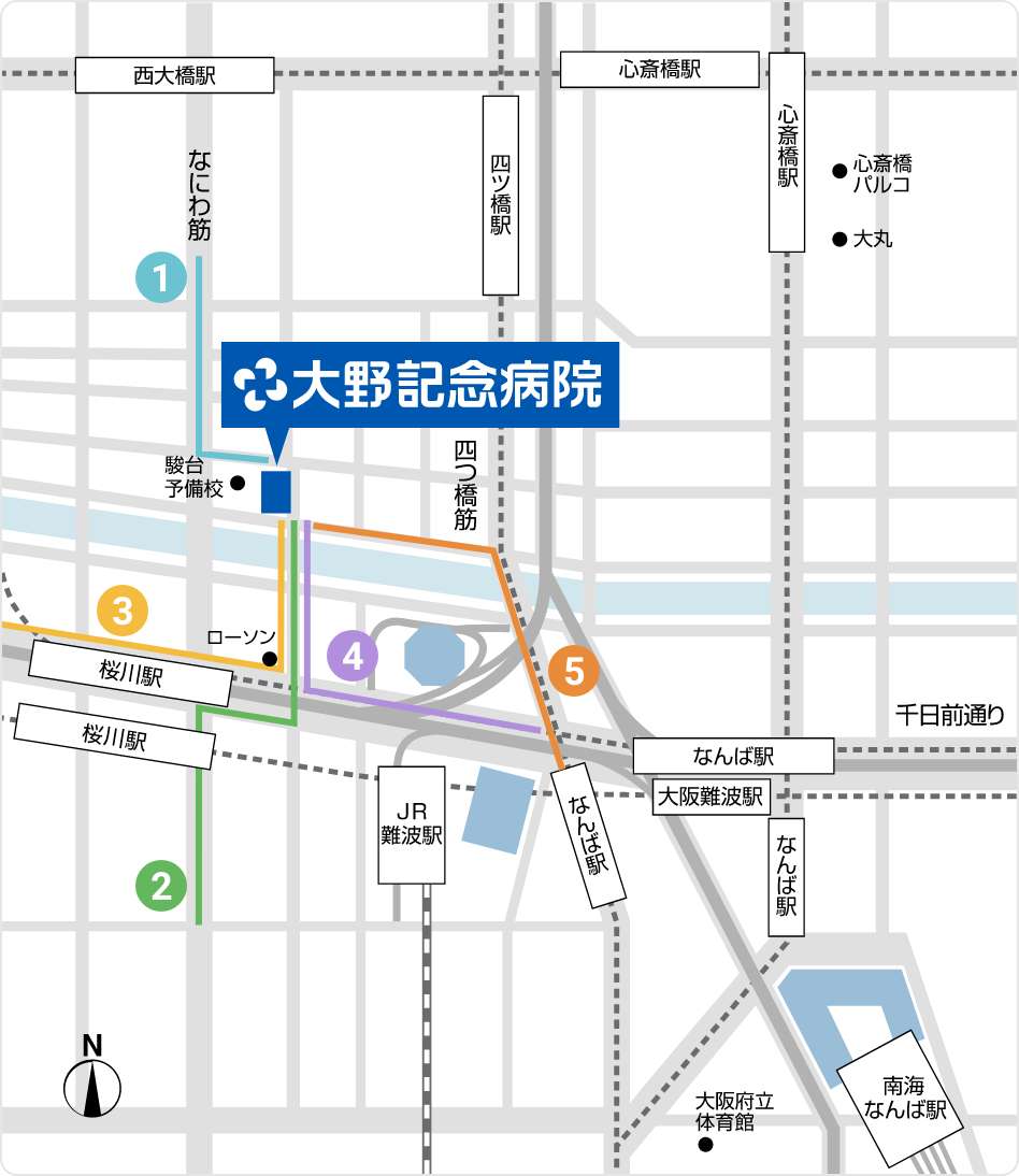 西道頓堀橋北交差点を側道にて南へ50m直進し、道頓堀川手前を左折。そのまま道頓堀川沿いを50m直進で左手に大野記念病院正面入口へ。病院沿いに交差点を左折、20m直進で左手当院駐車場入口へ。
