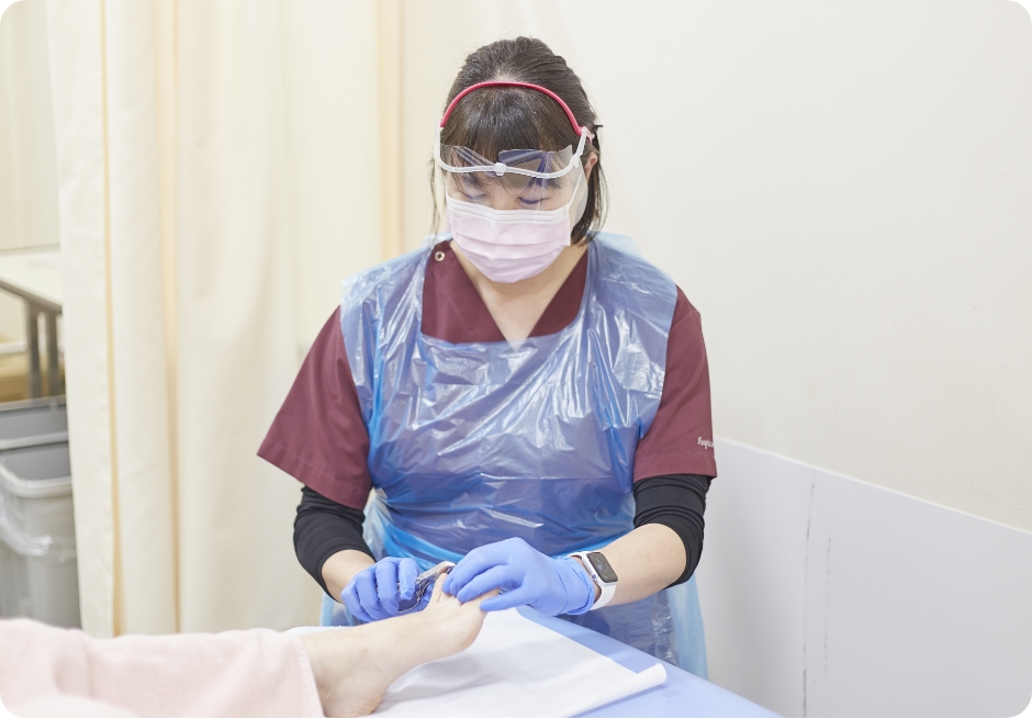 フットケア外来では外来スタッフと協働して、爪切りや胼胝・鶏眼処置などのケア実践に加え、保湿ケアや足の観察の方法、靴選びなどセルフケア指導を行います。