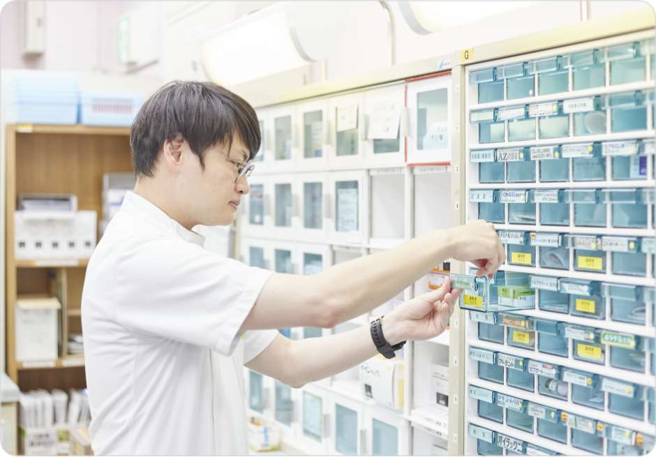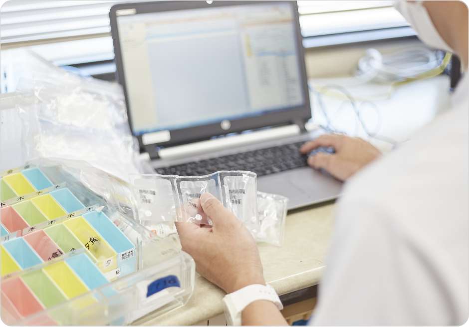 大野記念病院薬剤部は、個々の薬剤師が自らのビジョンを持ち、専門知識の研鑽と技術の向上により患者様からも医療スタッフからも「求められる存在」となり、安全で質の高い薬物療法を実践するために、医薬品管理や情報提供などを通じてチーム医療に参画しています。
