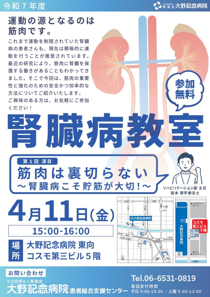 運動の源となるのは筋肉です。これまで運動を制限されていた腎臓病の患者さんも、現在は積極的に運動を行うことが推奨されています。最近の研究により、筋肉に腎臓を保護する働きがあることもわかってきました。そこで令和7年度第1回目は、筋肉の重要性と強化のための安全かつ効率的な方法についてご紹介いたします。