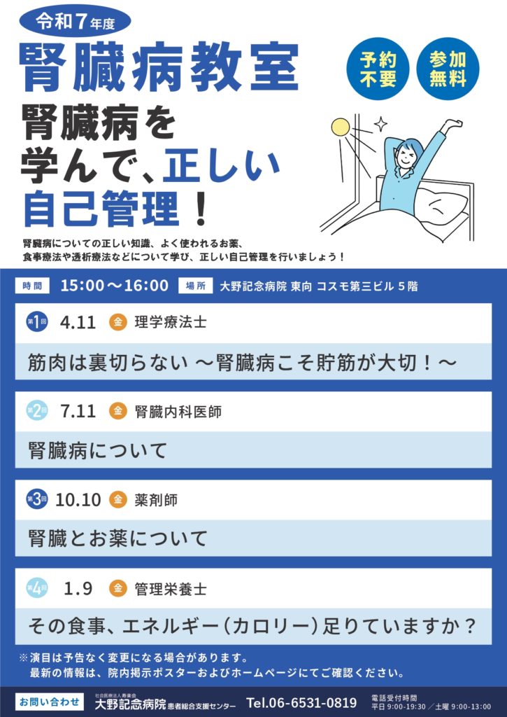 当教室では専門職が、腎臓病についての正しい知識、よく使われるお薬、食事療法や透析療法を中心に解説し、正しい自己管理ができるようにお手伝いします。ぜひご参加ください。