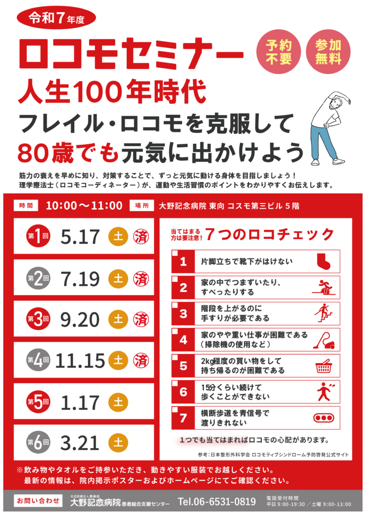 令和7年度より、皆さまの健康な日々を支えるために、リハビリテーション部では2カ月に一度のペースでロコモセミナーを開催いたしております。テーマは「ロコモティブシンドロームの予防と改善」です。