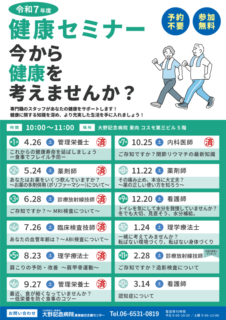 健康セミナーでは、疾病予防の方法やご自身の健康にお役立ていただけるような情報を各専門職からお話いたします。参加費は無料、事前の申し込みも必要ございません。当日は直接会場へお越し下さい。