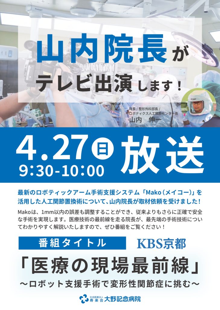 2025年4月27日にKBS京都で放送された「医療の現場最前線~ロボット支援手術で変形性関節症に挑む~」の動画が、大野記念病院YouTubeにてご覧いただけるようになりました。
