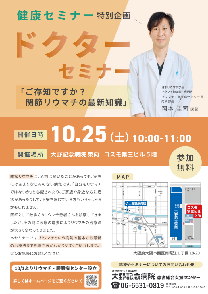 リウマチ指導医・専門医の岡本圭司先生による、関節リウマチの最新知識について講演します。