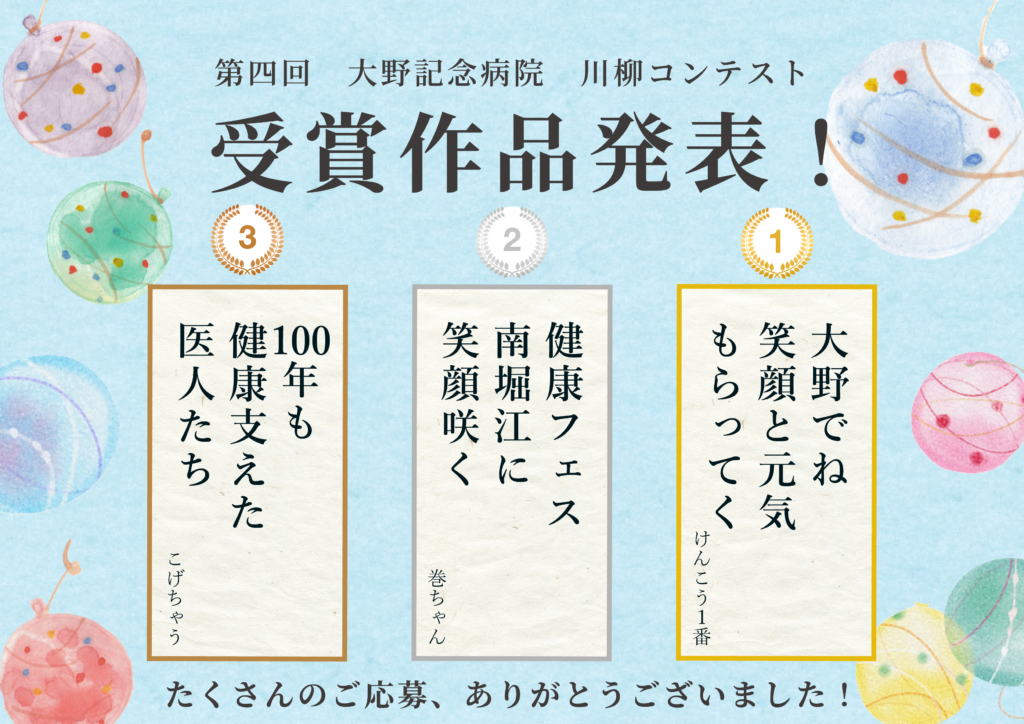 この度は、大野記念病院 第4回 川柳コンテストにご応募いただき、誠にありがとうございました。