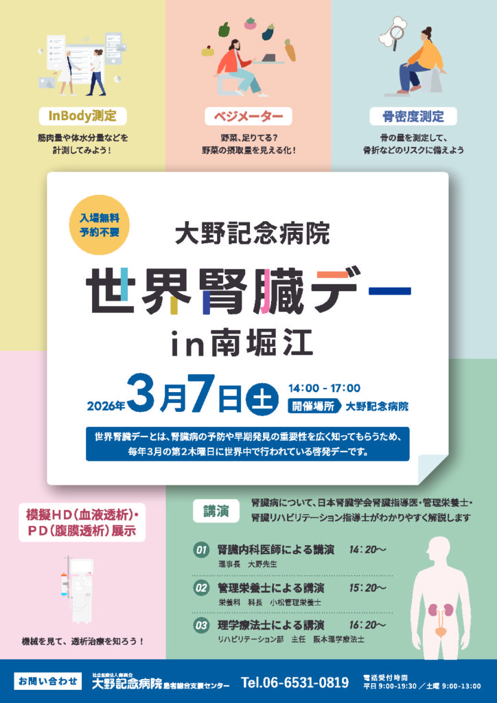 3月7日(土)14:00~ 大野記念病院「世界腎臓デー in南堀江」開催のお知らせ