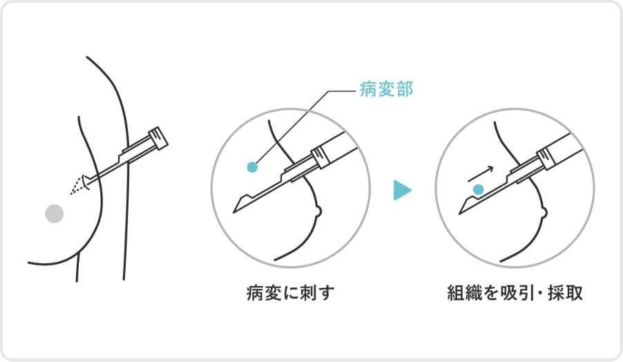 病理学的検査とは患者様の部分から採取された組織や細胞から顕微鏡標本を作り、それを病理医が観察して、どのような病気であるかを診断する検査です。マンモグラフィ検査や超音波検査を行っても乳房内の病変が良性か悪性か判定できない場合や悪性を疑う場合に病理学的検査を行います。病理学的検査には患者様の負担やかかる時間・正確性などによる違いがあります。
