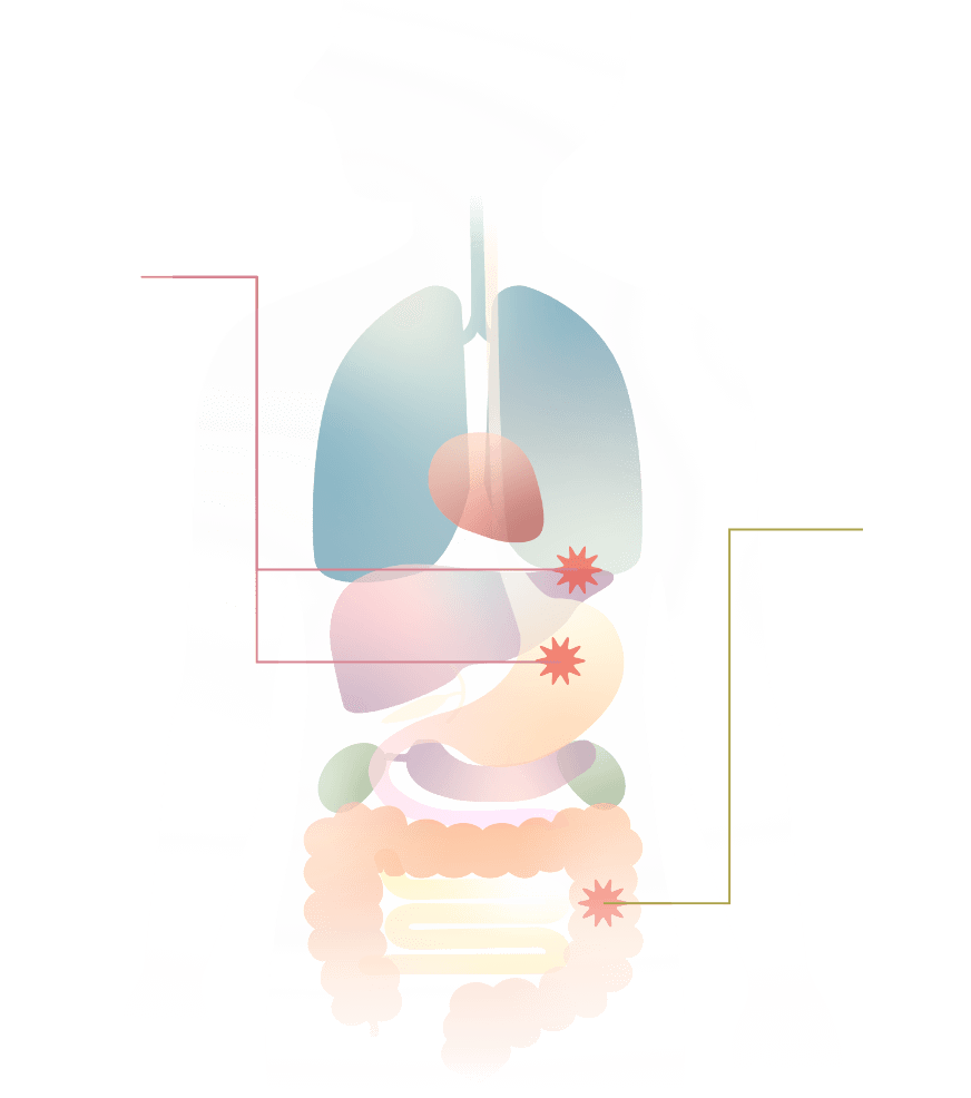 消化器内科では、食道・胃・十二指腸・小腸・大腸・肝・胆・膵の多岐にわたる消化器疾患に対応し、緊急例からがん治療まで幅広い診療を行っています。胃潰瘍、十二指腸潰瘍、感染性胃腸炎、憩室炎、急性膵炎、胆管炎といった良性疾患の診療だけでなく、消化器がんに対する診療も積極的に行っています。
