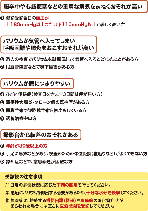 | 事故防止のため、次の項目等に該当する方は、受診をお断りすることがあります。 安全な健診を実施するために、何卒ご理解くださるようお願いいたします。 |