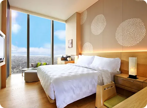 なんば駅より3駅目6分の天王寺駅直上にあり、天空の癒し空間にふさわしい部屋からの眺めは西側は明石海峡大橋、東側は生駒山まで広がります。館内最上60階には360°の展望台『ハルカス300』、ハルカス美術館や百貨店も下層に。また、徒歩すぐに天王寺公園、通天閣もそのお隣です。