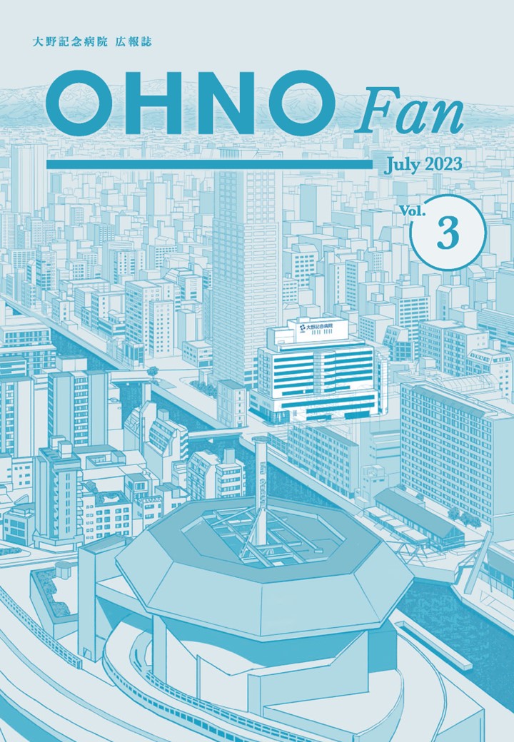 『OHNO Fan』には、もっと当院について知っていただき、「大野記念病院のファンになっていただきたい」という意味が込められております。当院の各部署紹介や、 病気の事、トピックスなど患者さんや地域住民の皆様そして地域医療を支える病診連携登録医の先生方に知っていただきたいことや当院の取り組みなどを中心に掲載しております。多くの方に読んでいただき、当院の“Fan”になっていただけますと幸いです。ぜひご覧ください。